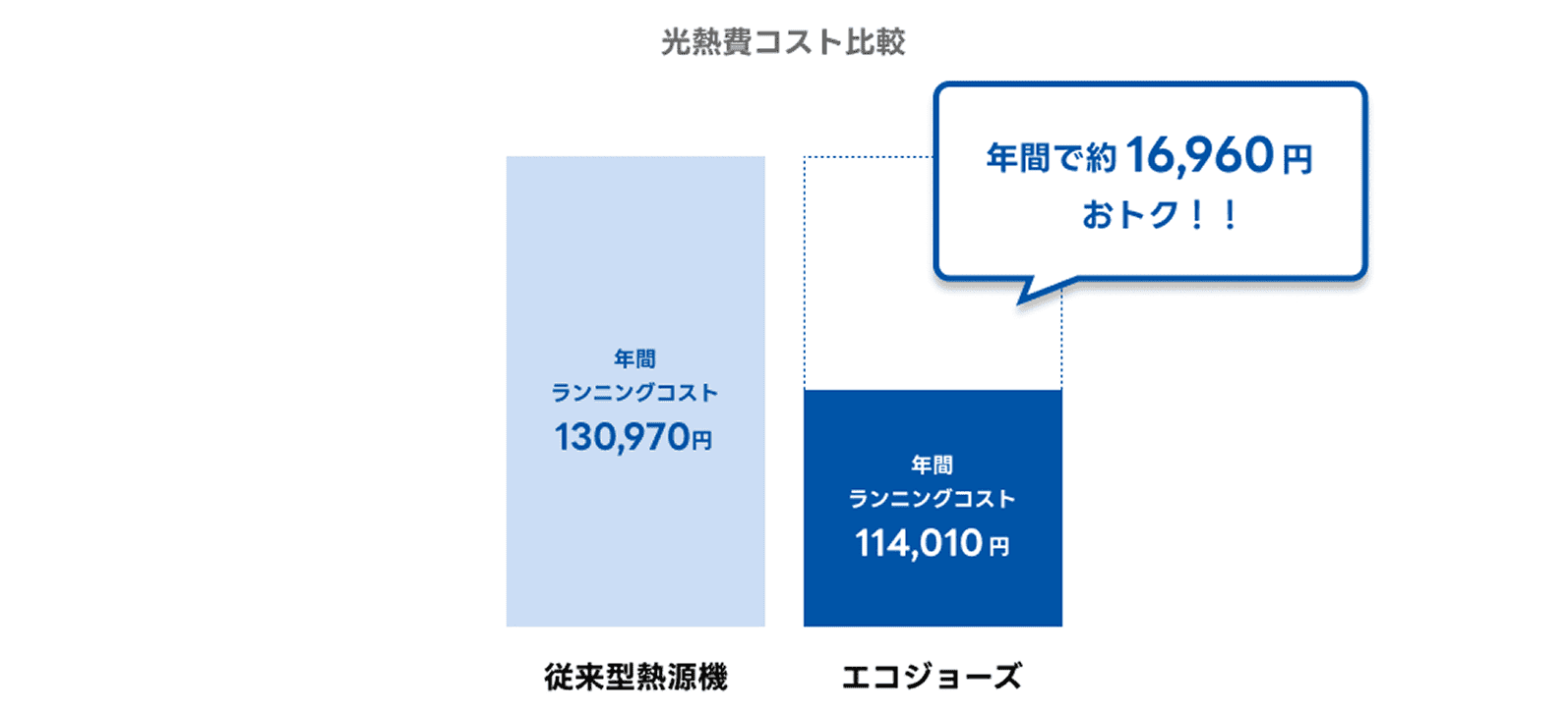 熱効率がアップすることで、給湯に必要なガス使用量が約12%削減。つまり、ガス料金も約12%分減らせます。従来型と同じだけのお湯を使っても、年間約16,960円の節約になります。