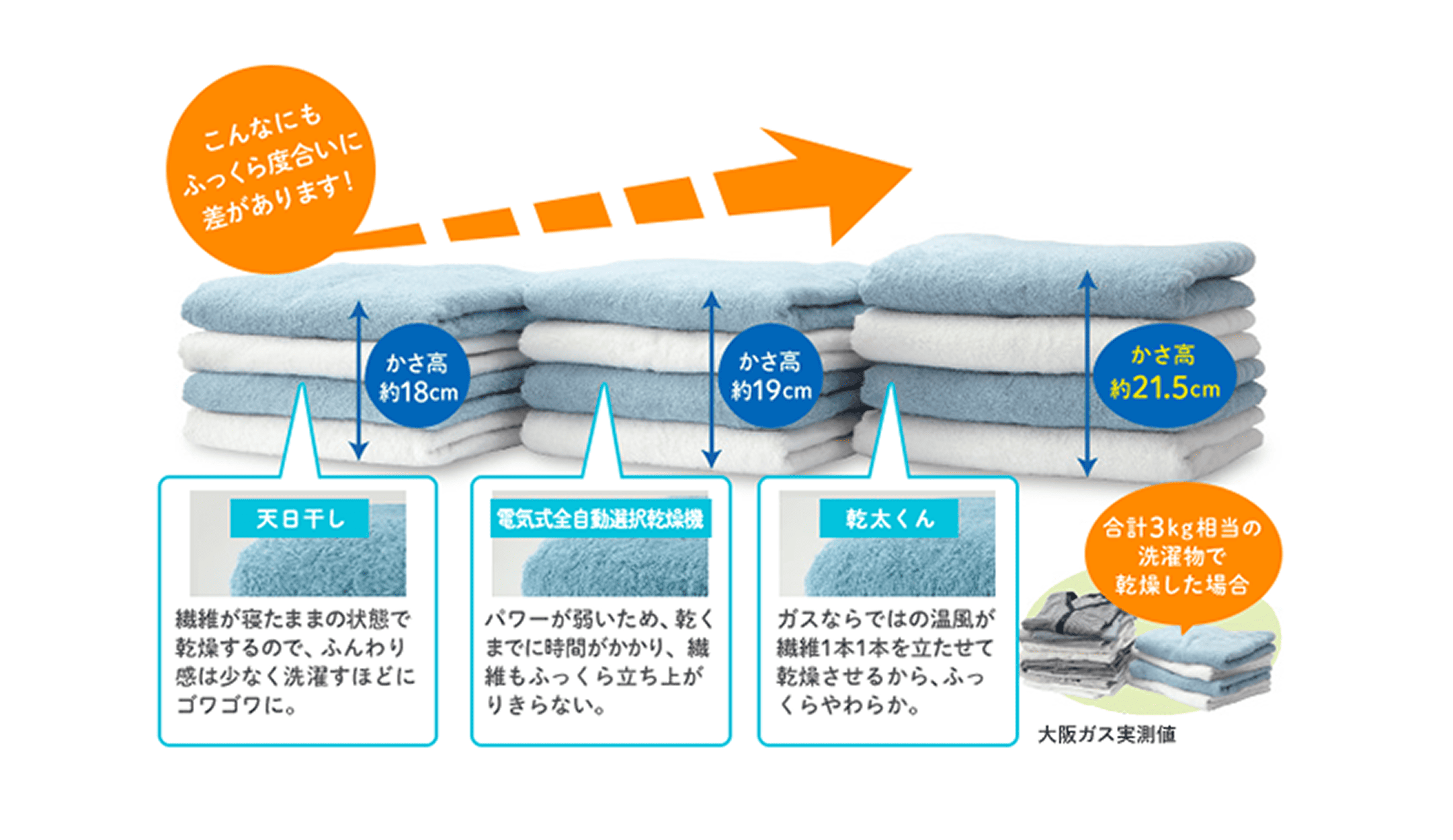 大容量ドラム×ガス温風でしっかり乾かしながら、洗濯物の繊維の一本一本を根元から立ち上げます。繊維が寝たままになりがちな天日干しとは、仕上がりに雲泥の差が出ます。